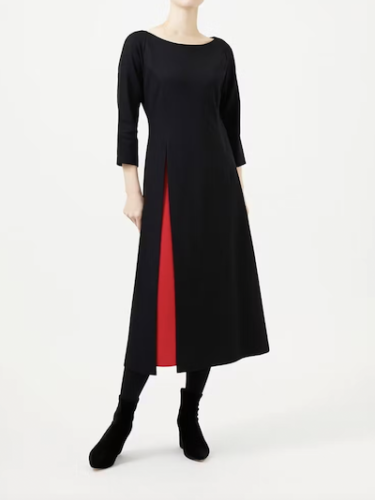 サイドスリットから覗く配色スカートが印象的なレイヤードスタイルのドレスです。