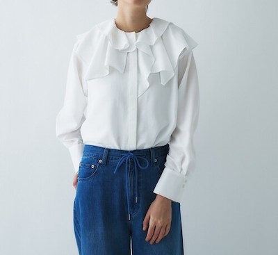 配色のはしごレースをあしらった大きなフリルがポイントのシャツブラウスです。