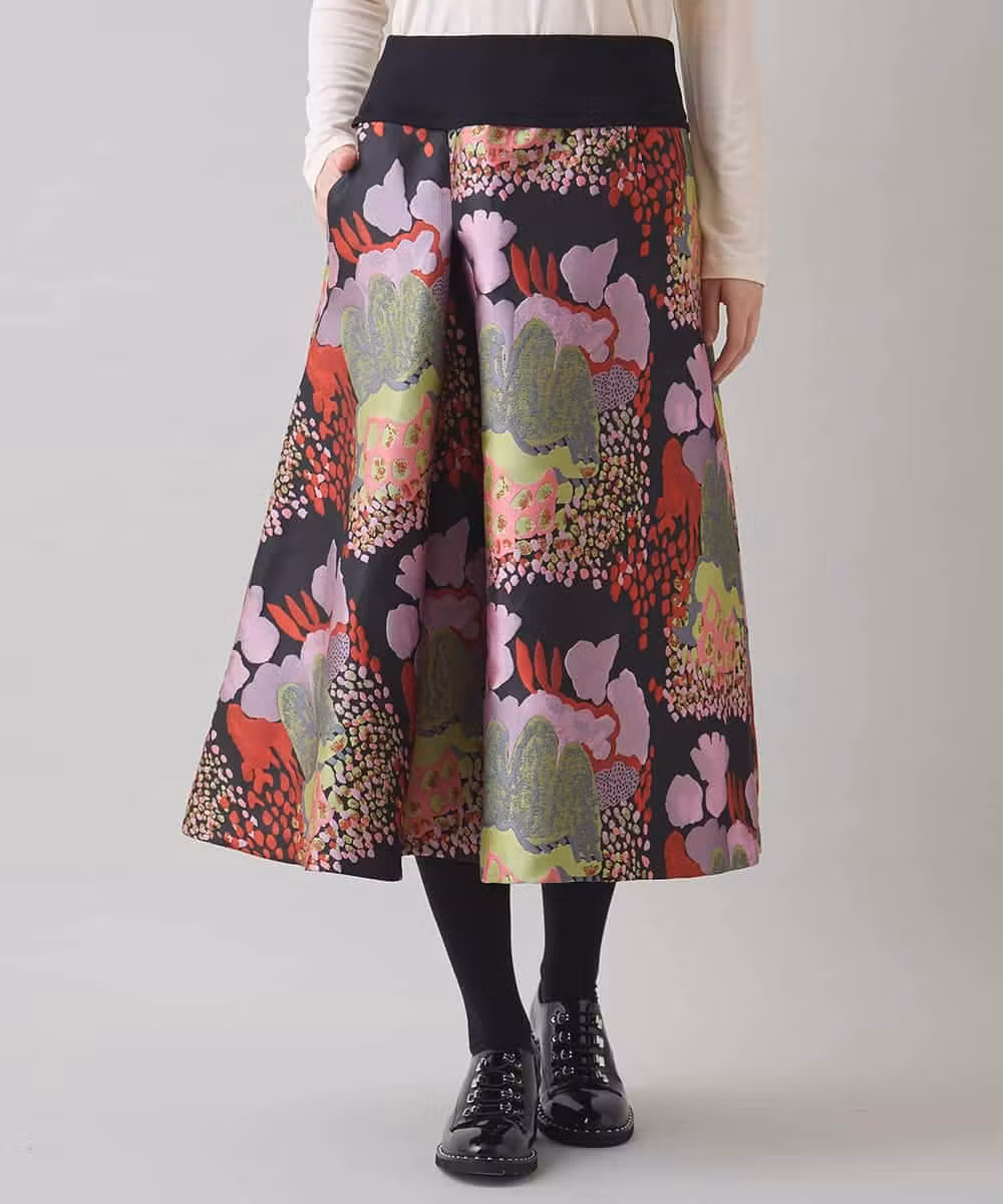 発色の美しい、絵画柄のジャカードフレアスカートです。