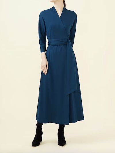 カシュクールデザインがエレガントな、ブルーのジャージードレスです。