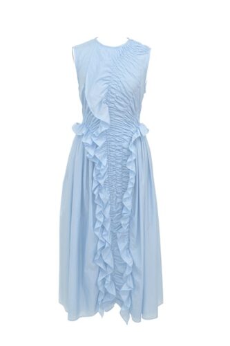 ラッフルとギャザーのディテールが目を惹くライトブルーのドレスです。
