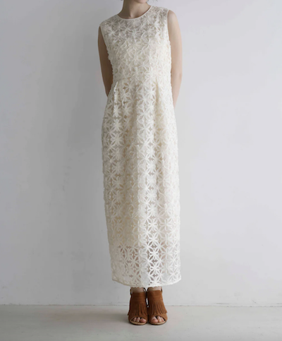 繊細なリボン刺繍が目を惹く、アイボリーのノースリーブワンピースです。