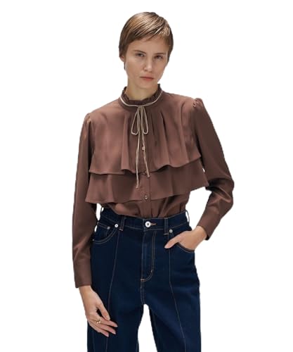 ネックラインにあしらわれたベロアリボンが上品で華やかな、ブラウンのフリルブラウスです。