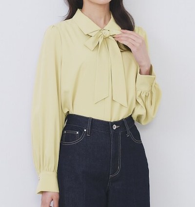 鮮やかなグリーンのボウタイブラウスです。